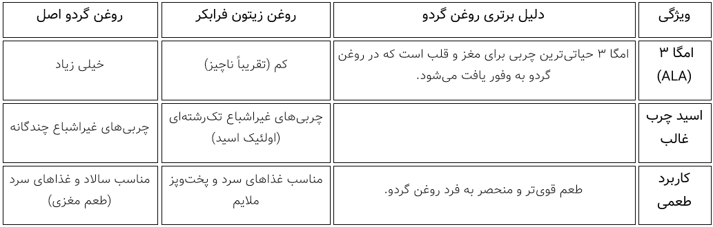 روغن زیتون، به ویژه نوع فرابکر، یک چربی سالم است، اما در مقایسه با روغن گردو، یک تفاوت کلیدی وجود دارد :
