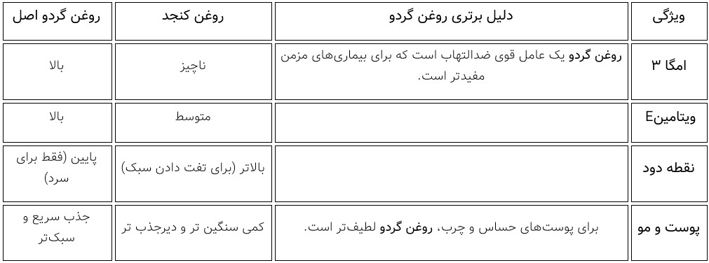 نتیجه : برای مصرف درمانی (ضدالتهاب) و مراقبت های پوستی ظریف تر، روغن گردو انتخاب ملایم تر و غنی تری است.